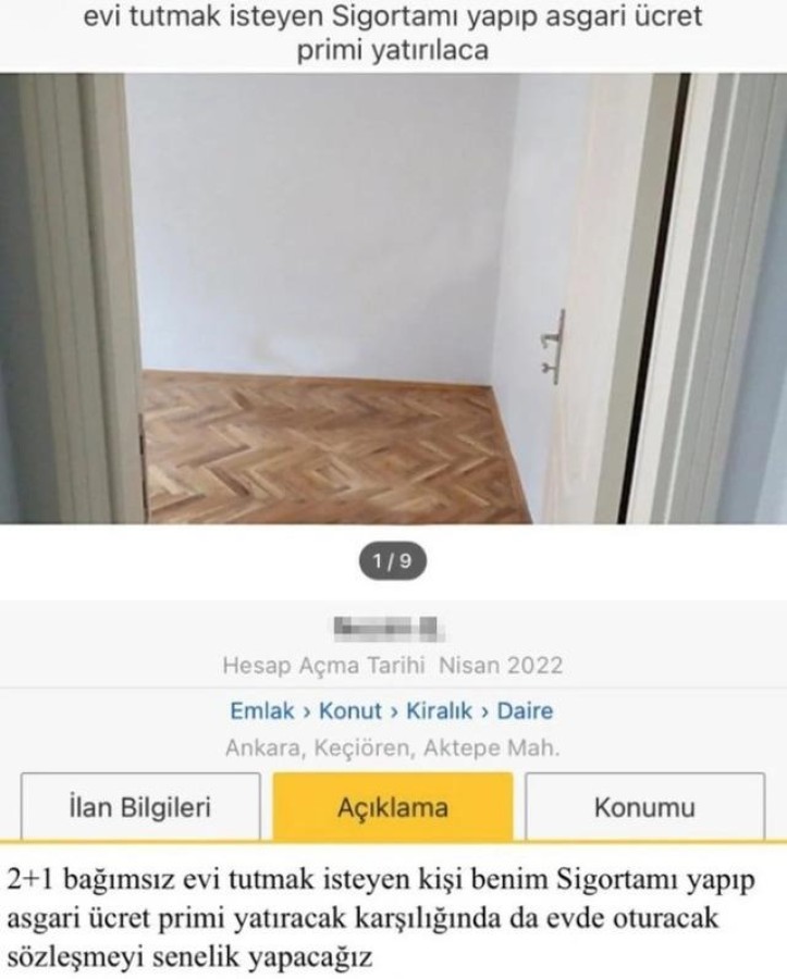 Ankara'nın Keçiören ilçesindeki ev sahibi verdiği ilanda kiracısından kira bedeli yerine asgari sigorta primi ve sigorta istedi.
