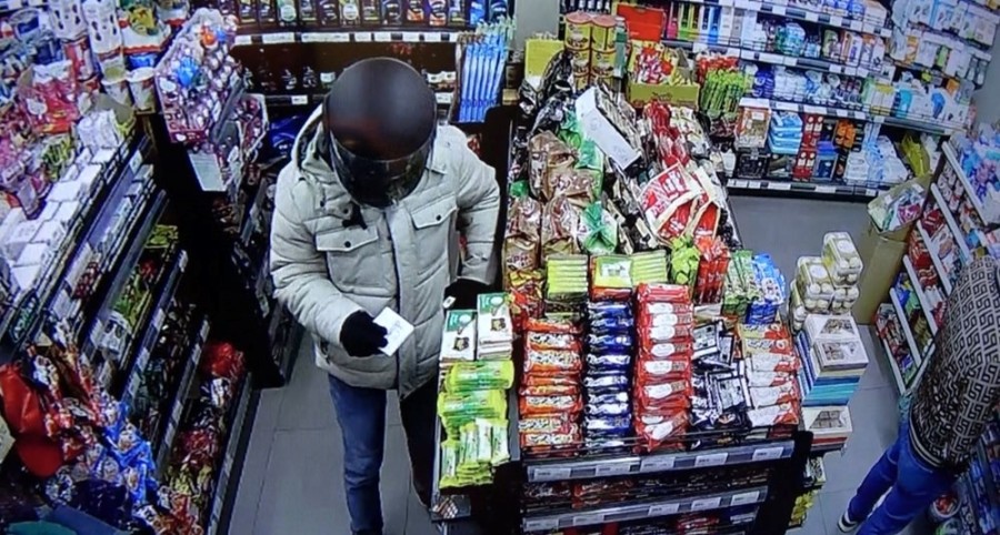 Şamlı Mahallesi'ndeki bir akaryakıt istasyonunun marketinde plakasız motosikleti ile akaryakıt istasyonuna gelen kişi, elindeki kaskını takıp markete girdi.