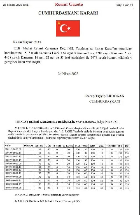 İthalat rejimi kararında değişiklik yapıldı. Değişiklikle birlikte daha önce alınan kararlarla gümrük vergisi sıfırlanan buğdayın vergisi yüzde 130 a yükseltildi.
