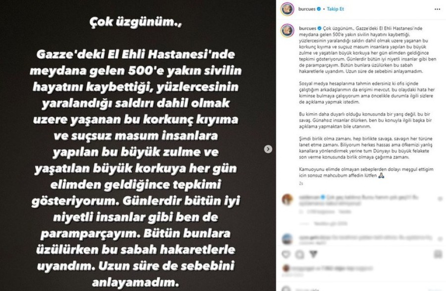 "Gazze'deki El Ehli Hastanesi'nde meydana gelen 500'e yakın sivilin hayatını kaybettiği, yüzlercesinin yaralandığı saldırı dahil olmak üzere yaşanan bu korkunç kıyıma ve suçsuz masum insanlara yapılan bu büyük zulme ve yaşatılan büyük korkuya her gün elimden geldiğince tepkimi gösteriyorum. Günlerdir bütün iyi niyetli insanlar gibi ben de paramparçayım. Bütün bunlara üzülürken bu sabah hakaretlerle uyandım. Uzun süre de sebebini anlayamadım.