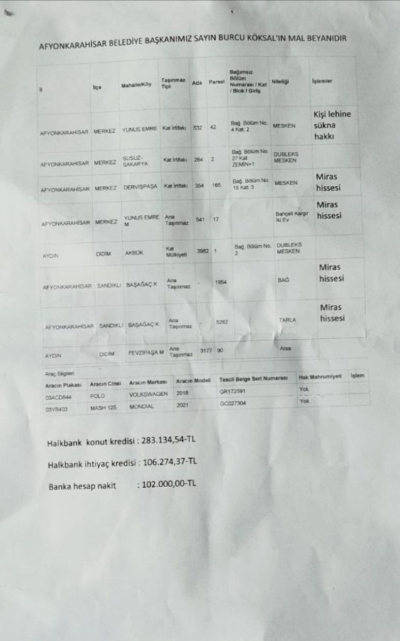 31 Mart yerel seçimleri öncesi CHP Genel Başkanı Özgür Özel Afyonkarahisar'da yaptığı konuşmasında CHP'nin bütün belediye başkanlarının mal varlıklarını belediyelerin girişine asacağını, Burcu Köksal'ın da seçildiğinde mal varlığını belediyenin girişine asacağını söylemişti.