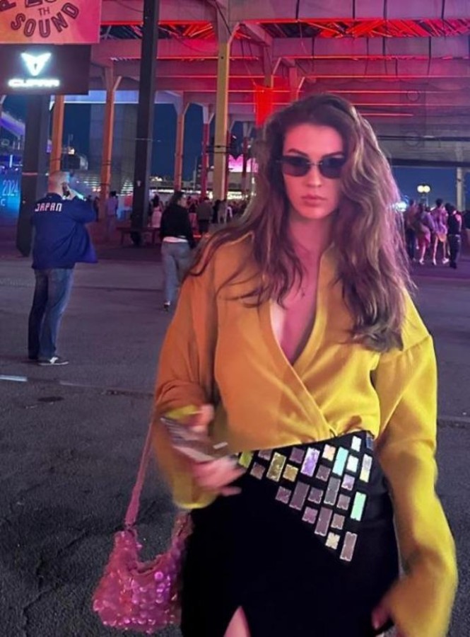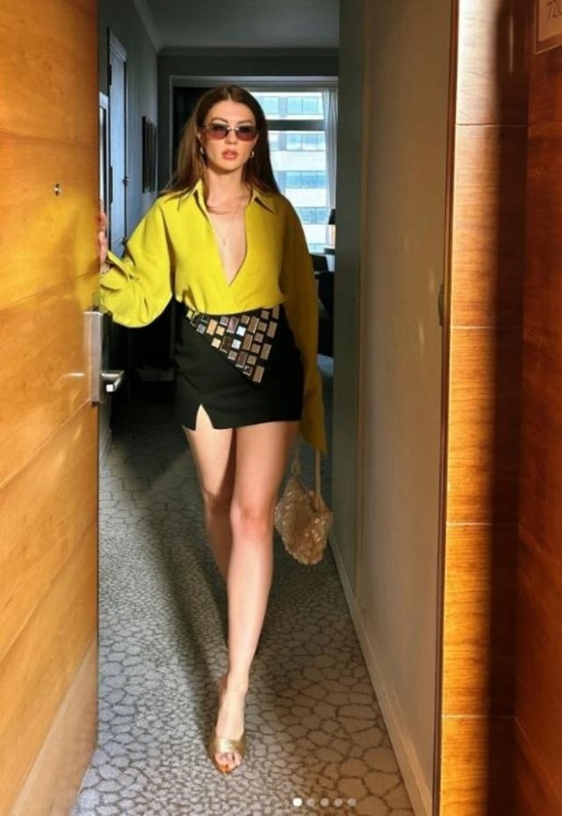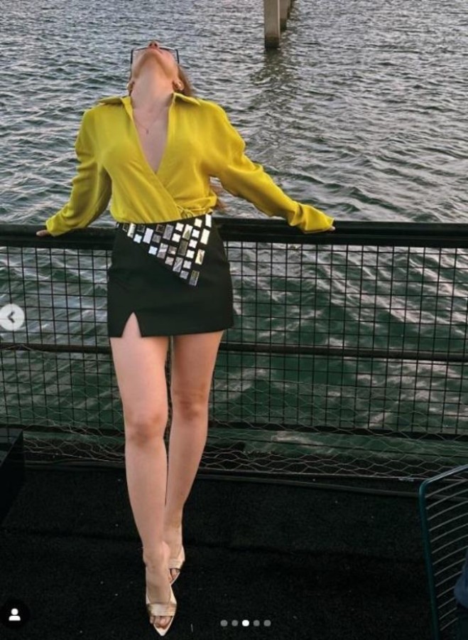 Barcelona'da tatilde olan Özberk siyah mini eteğini göğüs dekolteli sarı gömleğiyle kombinledi.