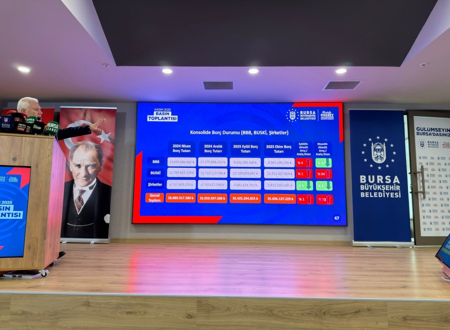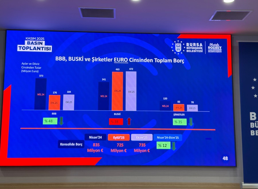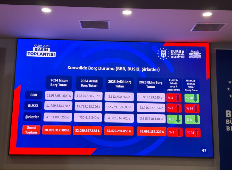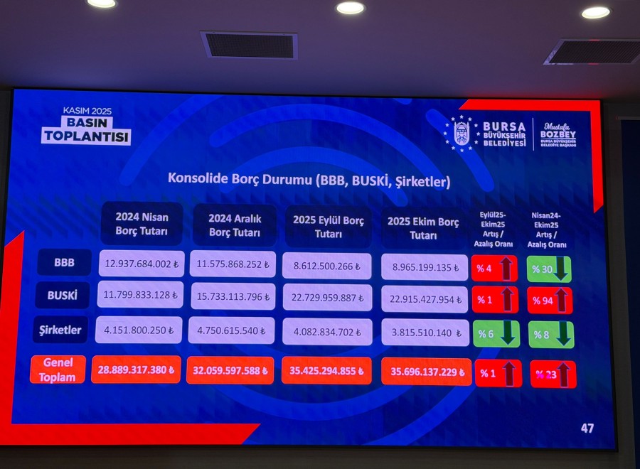 2025'in Eylül'ü ile 2025'in arasında BBB'de bir düşüş var, BUSKİ'de bir düşüş var, şirketlerde de bir düzelme durumu var; ama Nisan 2024'ten bugüne değerlendirdiğimizde, Büyükşehir'in borçlarında %30'luk bir azalma var, arkadaşlar. Şirketlerin borçlarında da yine yüzde sekizlik bir azalma var. Ancak BUSKİ'ye geldiğimizde karşımıza tablo acı bir şekilde çıkıyor.