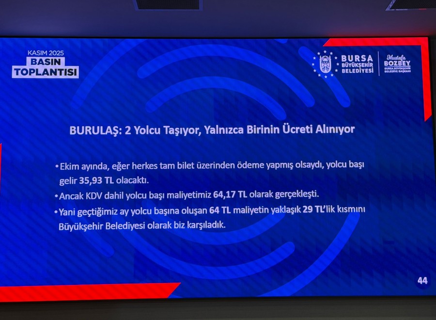 Diğer taraftan da tartışılan konu, biliyorsunuz Burulaş, zaman zaman gündeme geliyor. Burulaşla ilgili 2025 yılında inanılmaz bir destek yaptık, 2026 için ciddi bir rakam ayırıyoruz. Baktığımızda iki yolcu taşıyoruz, bir yolcunun parasını alıyoruz, o da maliyet değil; bakın, o daha yukarıda. Ancak alıcı, almış olduğumuz yolcu başına ücretle ilgili söylüyorum. Bazı yerlerde çok pahalı falan diyorlar. Aslında biz iki kişi taşıyoruz ama bir kişi alıyoruz.