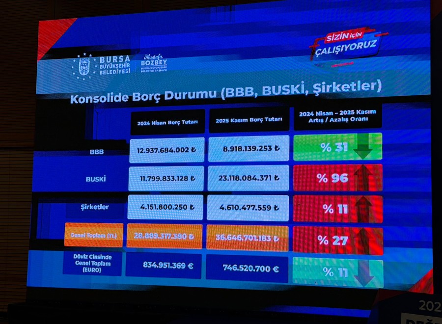 4 milyar civarında borcumuzda bir azaltma yaptık. Hem hizmet hem iş yaptık, hem de tasarrufla, doğru projeleri doğru zamanda uygulayarak bunu elde ettik. Kazancımız ne? %31 düşmüş. BUSKİ'yi hatırlarsınız; Ekim ayında, 2024'te "Müsaitim, önümüzdeki yıl 25'in sonunda BUSKİ'nin borcu 25 milyar civarına çıkacak." dedim. Meclis üyeleri buna güldüler. Kasım sonuna kadarmış, 23 milyar; hadi diyelim ki 24... 25 olmadı, 24 oldu. Artış 11.823 küsüre geldi, %96 BUSKİ'nin borcu arttı. Daha önce bunun sebeplerini sizlerle paylaştım; yanlış projelerden kaynaklı.