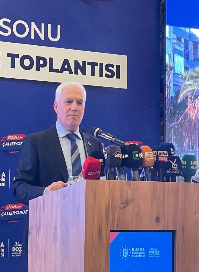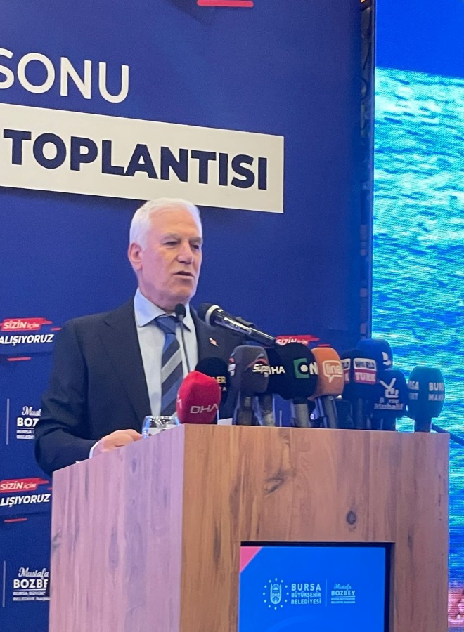 Bursa Büyükşehir Belediye Başkanı Mustafa Bozbey, Atatürk Kültür Merkezi Merinos Yerleşkesi'nde düzenlenen 2025 Yıl Sonu Değerlendirme Toplantısı'nda toplantısında konuştu.