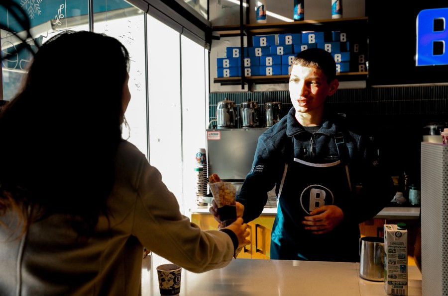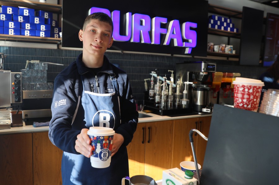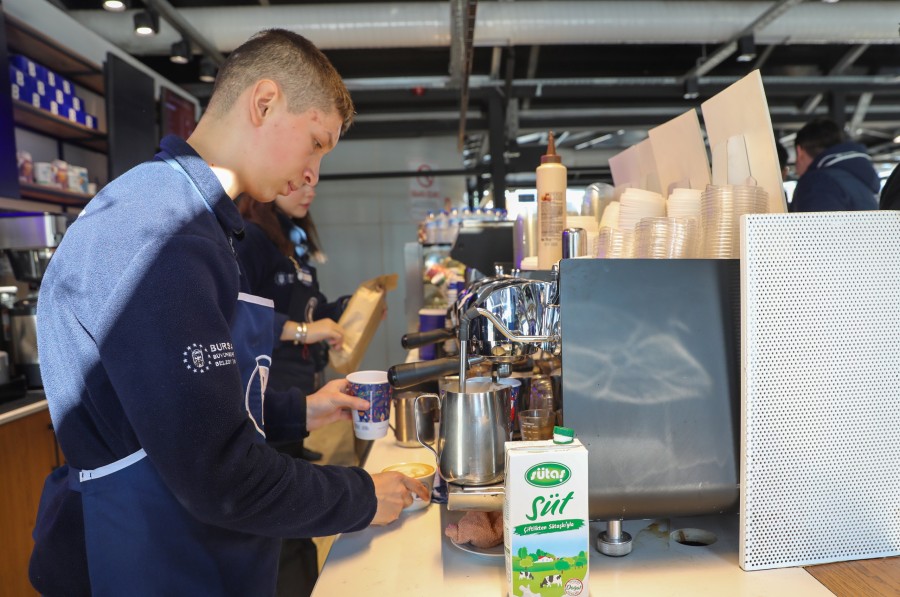 Merinos Parkı'ndaki BURFAŞ B Kafe'de stajyer barista olarak görev yapan 16 yaşındaki Ümit Hazar, barista önlüğünü giyerek personelle birlikte siparişleri titizlikle hazırlıyor. B Kafe'de staj yapmaktan mutluluk duyduğunu söyleyen Hazar, kafeye gelen vatandaşlardan da büyük takdir topluyor.
