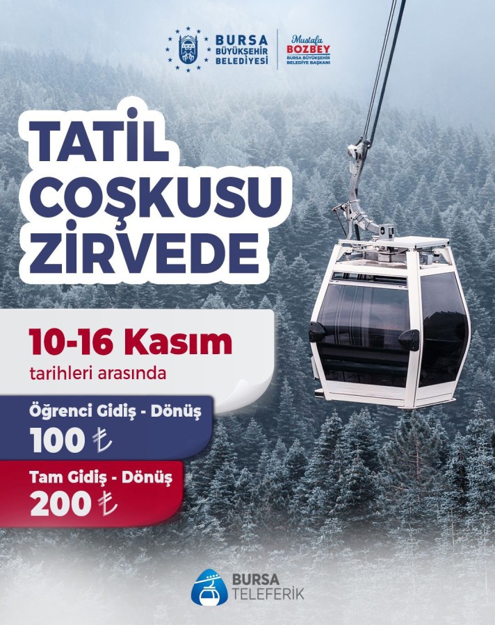 Bursa Büyükşehir Belediyesi, kentteki çocuklar, gençler ve ailelerin ara tatili dolu dolu geçirmesi için özel bir kampanya başlattı. "Ara Tatilde Zirveye!" sloganıyla duyurulan kampanya kapsamında, 10-16 Kasım tarihleri arasında Bursa Teleferik'te indirimli ulaşım imkânı sunulacak.