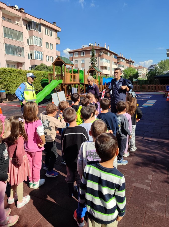 Bursa Büyükşehir Belediyesi Zabıta Dairesi Başkanlığı ekipleri tarafından Mualla Türkün Anaokulu'nda eğitim gören 4-5 yaş grubundaki anaokulu öğrencilerine yönelik 'Trafik güvenliği ve zabıta mesleği tanıtımı' eğitimi düzenlendi.