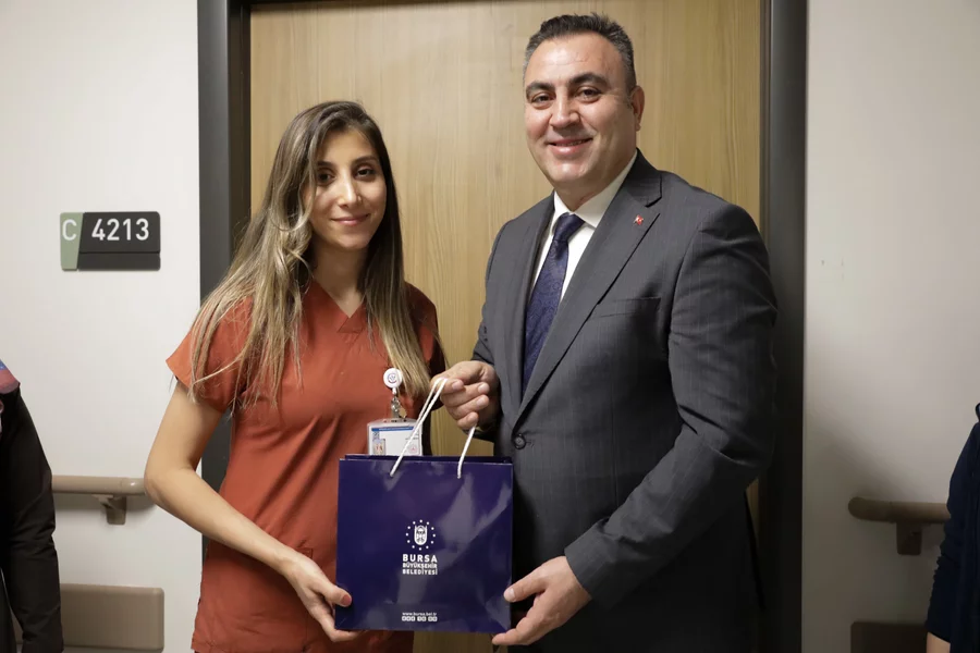 Büyükşehir Belediyesi Başkanvekili Mehmet Aydın Saldız, 2025'in son ve 2026'nın ilk ziyaretini Bursa Şehir Hastanesi'ne yaptı. Başkanvekili Saldız, beraberindekilerle birlikte hastane personeline çiçek ve çeşitli hediyeler verdi. Başkanvekili Saldız, bebekleri 2025 yılının doğan son bebeği olarak kayıtlara geçen Kader ve Deniz Kaplanoğlu çiftini ziyaret etti. Çocuklarına Manolya ismini veren Kaplanoğlu çiftine çiçek ve bebek seti hediye edilirken, Saldız minik bebeğe de altın taktı.