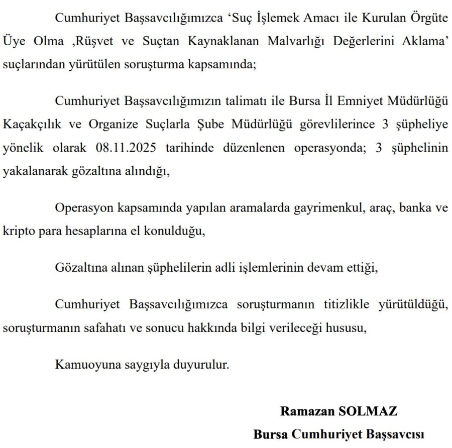 "Cumhuriyet Başsavcılığımızca 'Suç İşlemek Amacı ile Kurulan Örgüte Üye Olma ,Rüşvet ve Suçtan Kaynaklanan Malvarlığı Değerlerini Aklama' suçlarından yürütülen soruşturma kapsamında; Cumhuriyet Başsavcılığımızın talimatı ile Bursa İl Emniyet Müdürlüğü Kaçakçılık ve Organize Suçlarla Şube Müdürlüğü görevlilerince 3 şüpheliye yönelik olarak 08.11.2025 tarihinde düzenlenen operasyonda; 3 şüphelinin yakalanarak gözaltına alındığı,Operasyon kapsamında yapılan aramalarda gayrimenkul, araç, banka ve kripto para hesaplarına el konulduğu, Gözaltına alınan şüphelilerin adli işlemlerinin devam ettiği, Cumhuriyet Başsavcılığımızca soruşturmanın titizlikle yürütüldüğü, soruşturmanın safahatı ve sonucu hakkında bilgi verileceği hususu, Kamuoyuna saygıyla duyurulur"