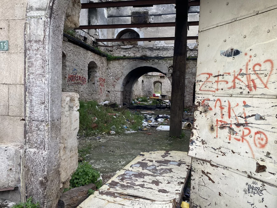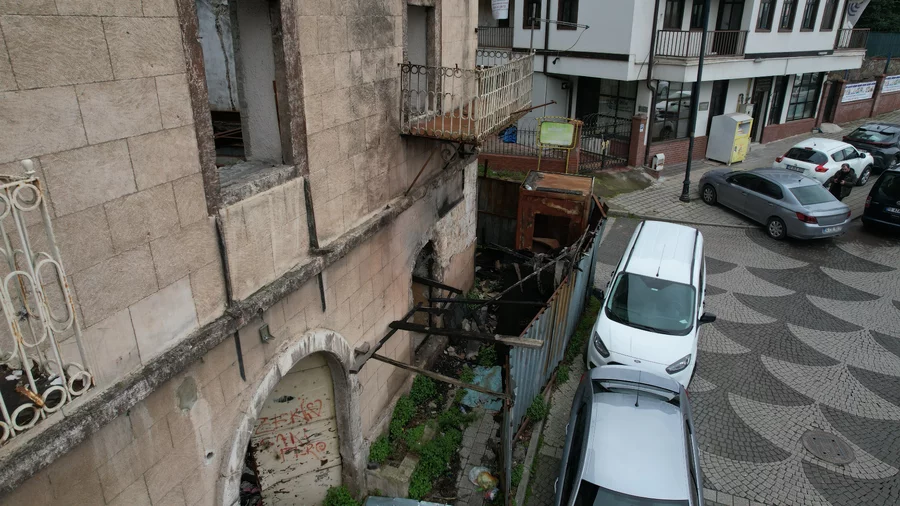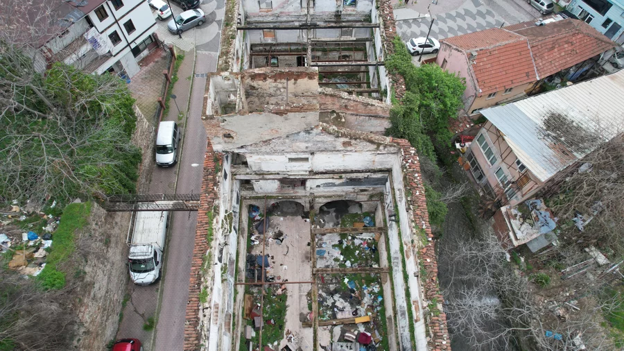 Osmangazi ilçesi Yahşibey Mahallesi'nde bulunan ve yangınla yeniden gündeme gelen tarihi binanın son durumu gün ışığında ortaya çıktı. Dron kamerasına yansıyan görüntülerde, binanın uzun süredir kullanılmadığı, camlarının kırıldığı ve iç kısmının büyük ölçüde tahrip olduğu görüldü.