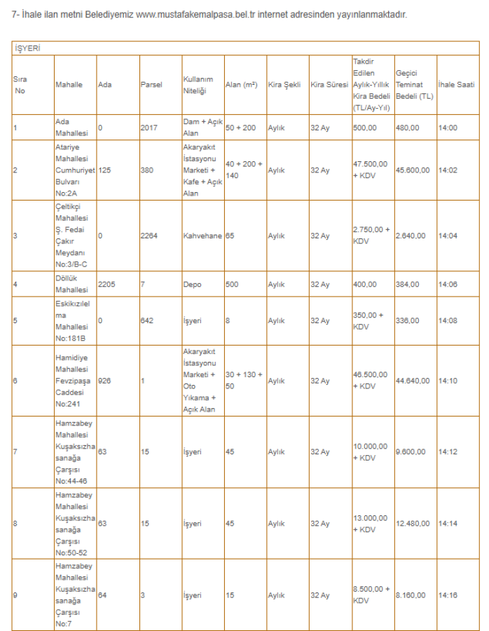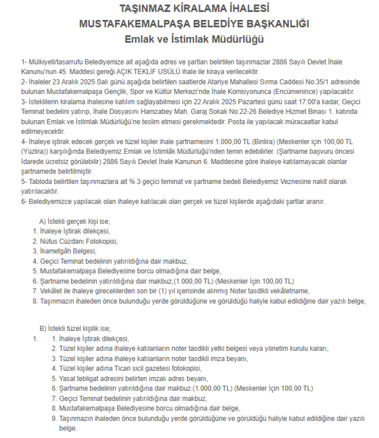 Mustafakemalpaşa Belediyesi, mülkiyeti ve tasarrufu kendisine ait 61 adet taşınmazı ihale yoluyla kiraya verecek.