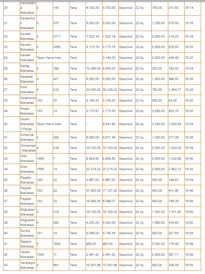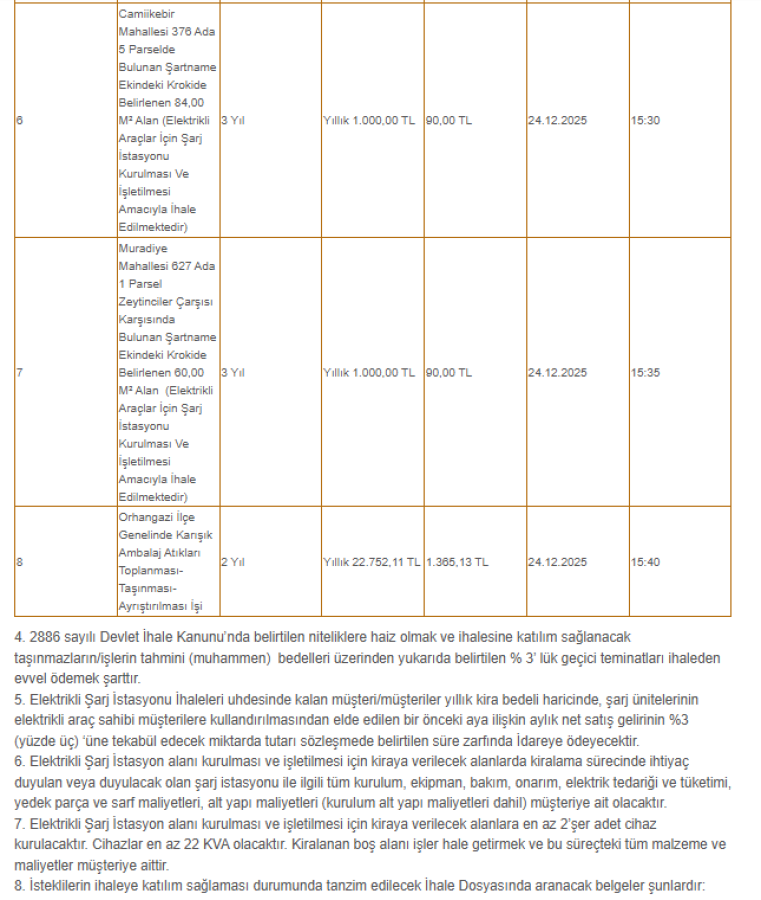 İhale kapsamında umumi tuvaletler, iş yerleri, köy kahvehanesi, baz istasyonu alanı, elektrikli araç şarj istasyonu alanları ve ambalaj atıkları toplama işi yer alıyor.