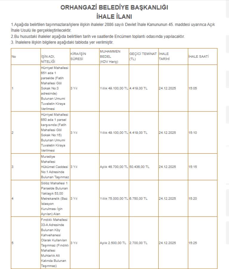 Orhangazi Belediyesi, ilçe genelinde bulunan 8 adet taşınmaz ve hizmet işini, açık ihale usulüyle kiraya verecek. İhaleler, 24 Aralık 2025 Çarşamba günü, Orhangazi Belediyesi Encümen Toplantı Odası'nda gerçekleştirilecek.