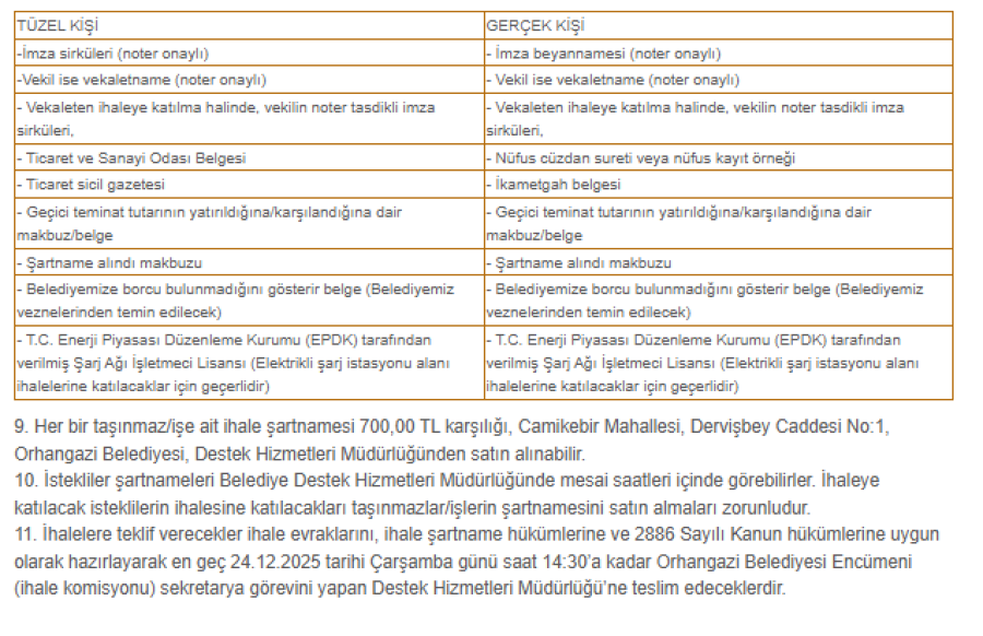 İhaleye katılmak isteyen gerçek ve tüzel kişilerin, 22 Aralık 2025 Pazartesi günü saat 17.00'ye kadar geçici teminat bedelini yatırarak ihale dosyalarını Belediye Hizmet Binası Emlak ve İstimlak Müdürlüğü'ne elden teslim etmeleri gerekiyor.