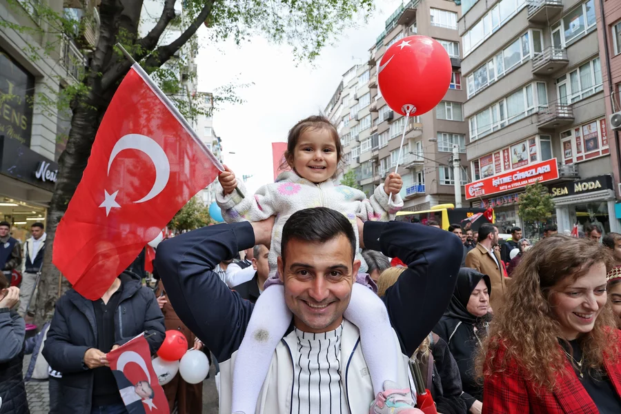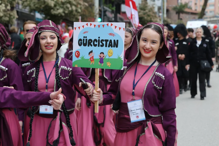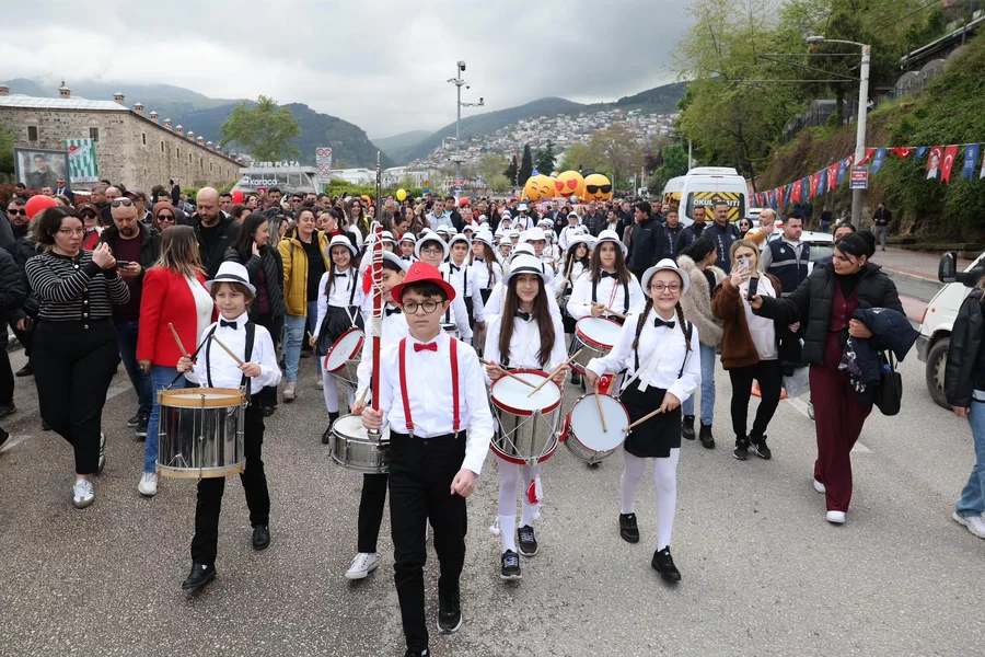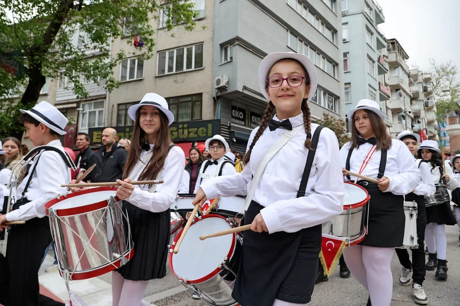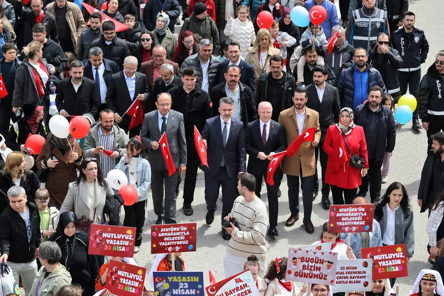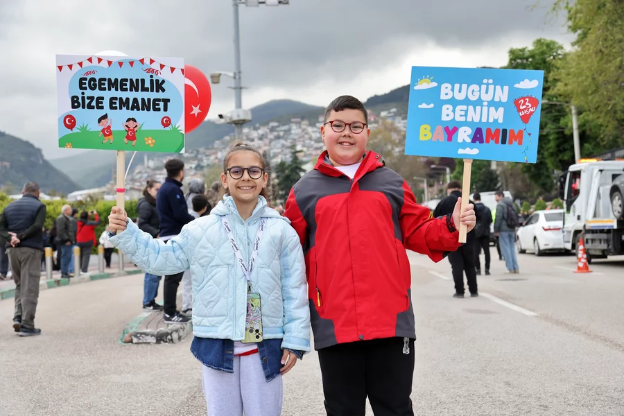 23 Nisan coşkusu, yüzlerce çocuk ve ailelerinin katılımıyla Çarşıbaşı'ndan Atatürk Stadyumu Kütüphanesi'ne doğru yapılan kortej yürüyüşüyle başladı. Ellerinde Türk bayraklarıyla marşlar ve şarkılar söyleyen çocuklara, Büyükşehir Belediyesi Başkan Vekili Şahin Biba, AK Parti Bursa İl Başkanı Davut Gürkan, AK Parti Bursa Milletvekili Mustafa Yavuz, Büyükşehir Belediyesi Genel Sekreteri Deniz Köken, meclis üyeleri, siyasi parti temsilcileri, sivil toplum kuruluşları üyeleri ve aileler de eşlik etti. Çocuklar, ellerindeki pankartlar, Türk ve Atatürk bayraklarıyla Atatürk Stadyumu Kütüphanesi'ne kadar bando eşliğinde coşkuyla yürüdü.