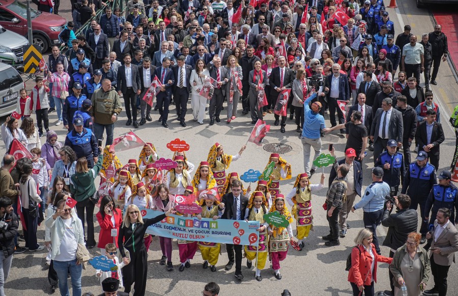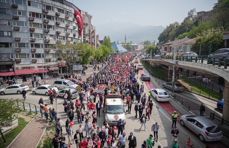 23 Nisan Ulusal Egemenlik ve Çocuk Bayramı tüm Türkiye'de olduğu gibi Bursa'da da büyük bir coşkuyla kutlandı. Bursa Büyükşehir Belediyesi tarafından 'Onların Gülüşü Hepimizin Yarını' teması ile hazırlanan '23 Nisan Çocuk Şenliği'nde çocuklar, dolu dolu program içeriğiyle unutulmaz bir gün geçirdi. 23 Nisan coşkusu, yüzlerce çocuk ve ailelerinin katılımıyla Altıparmak Caddesi'nden Merinos Parkı'na doğru yapılan kortej yürüyüşüyle başladı.