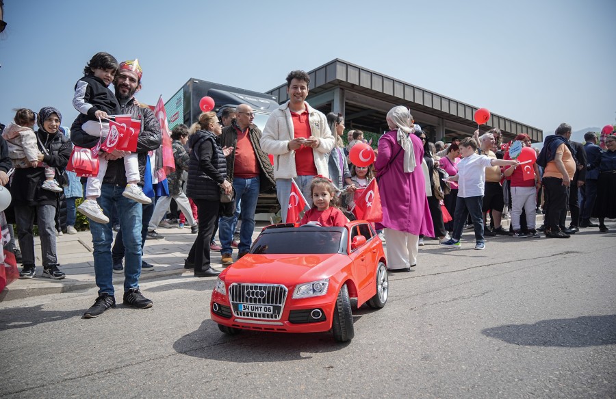 Bursa Büyükşehir Belediyesi tarafından düzenlenen Çocuk Şenliği'nde çocuklar, birbirinden renkli etkinliklerle Ulusal Egemenlik ve Çocuk Bayramı'nın tadını çıkarttı. Altıparmak'tan kortej yürüyüşüyle başlayan programda çocuklar ellerinde Türk bayraklarını sallayarak Merinos Parkı'na kadar yürüdü.