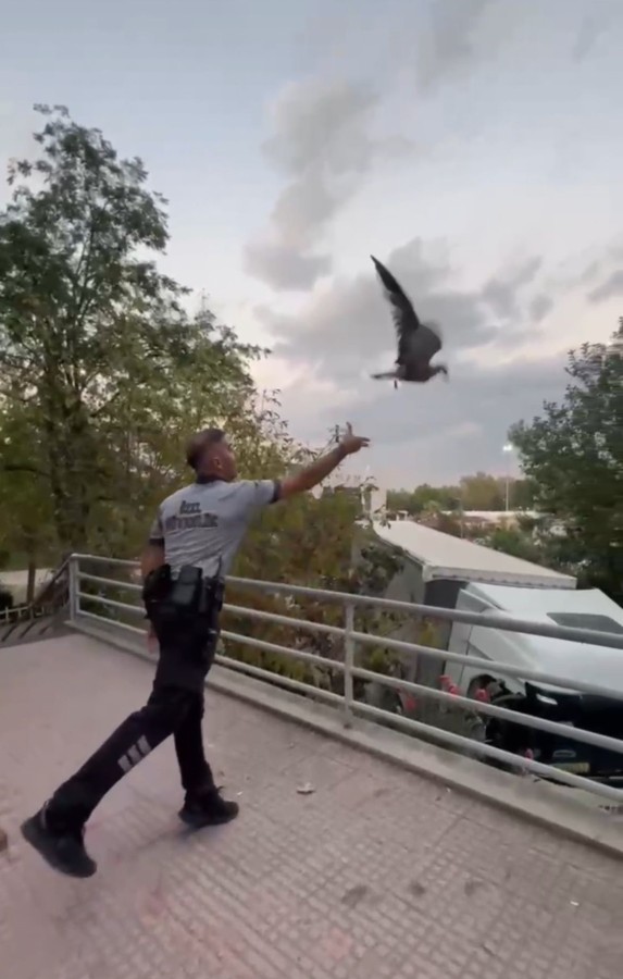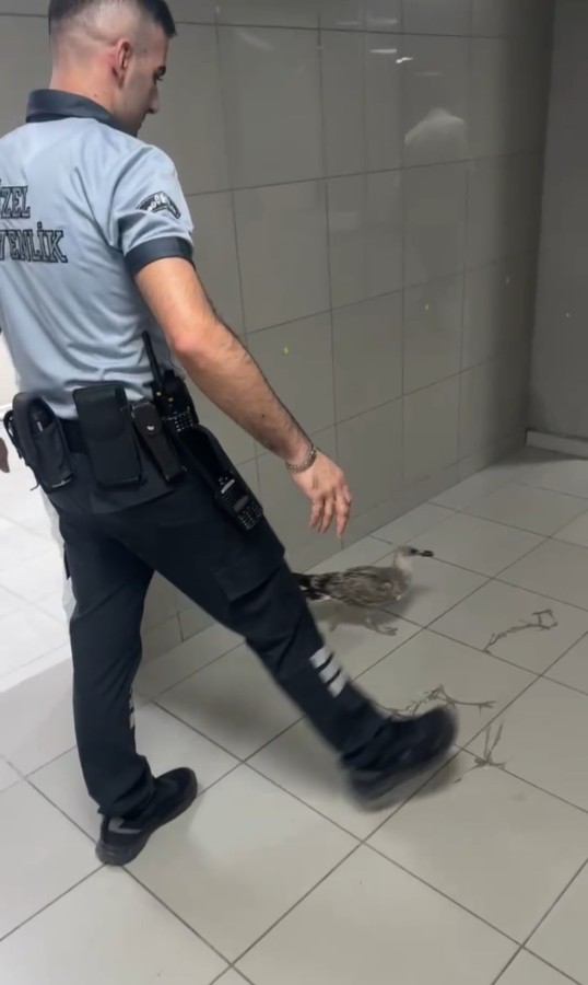 Yaşanan renkli anlar, vatandaşların yüzünü güldürürken martı, güvenlik görevlisinin ellerinden yeniden özgürlüğe kanat çırptı.