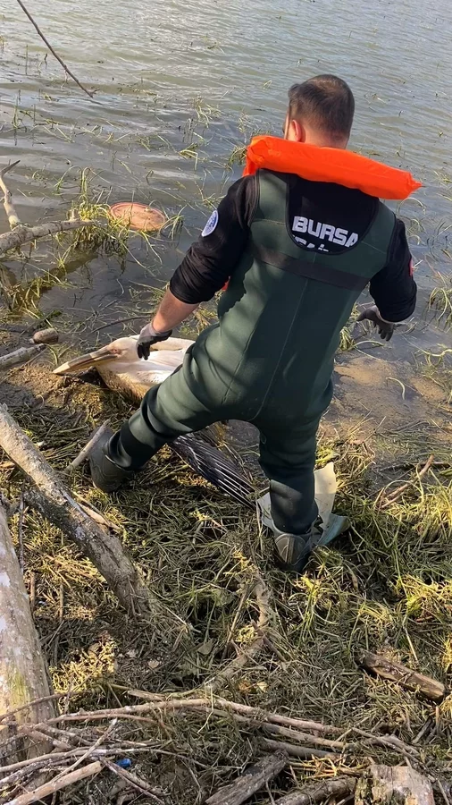 Olay, İnegöl Boğazköy Barajı çevresinde meydana geldi. Baraj kenarından geçen vatandaşlar, su içerisindeki çalılık alanda hareketsiz halde bulunan pelikanı fark etti.