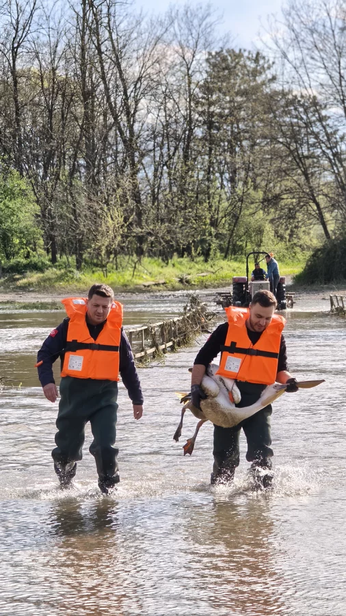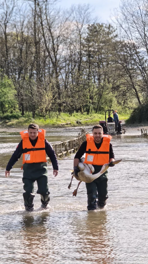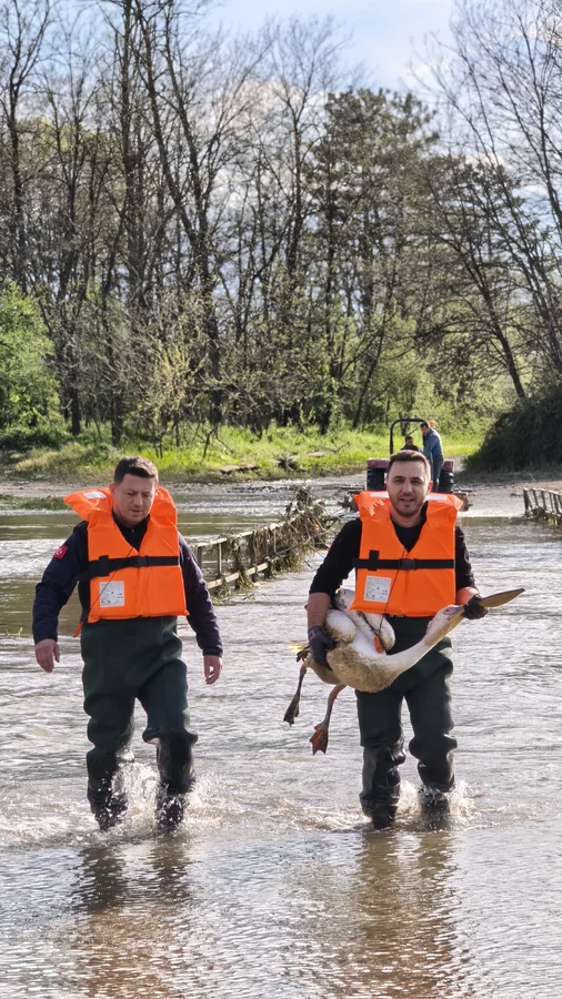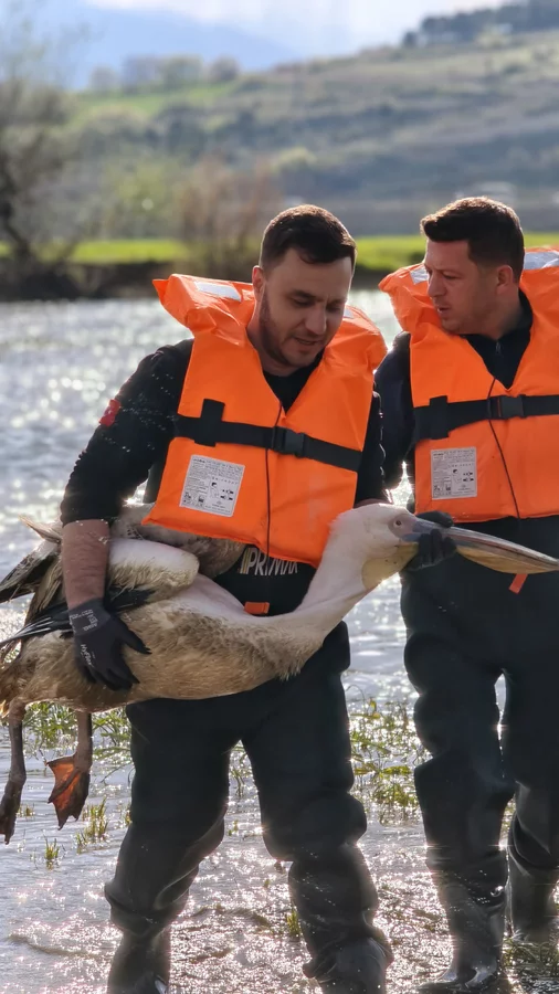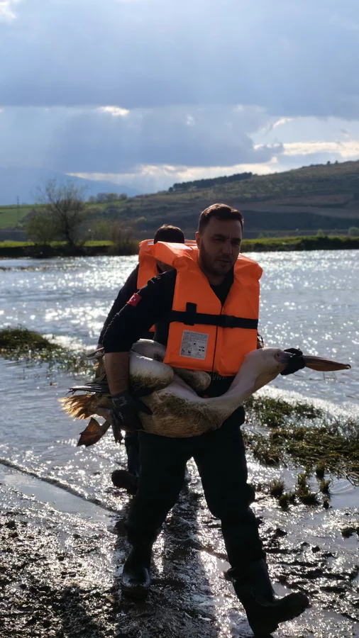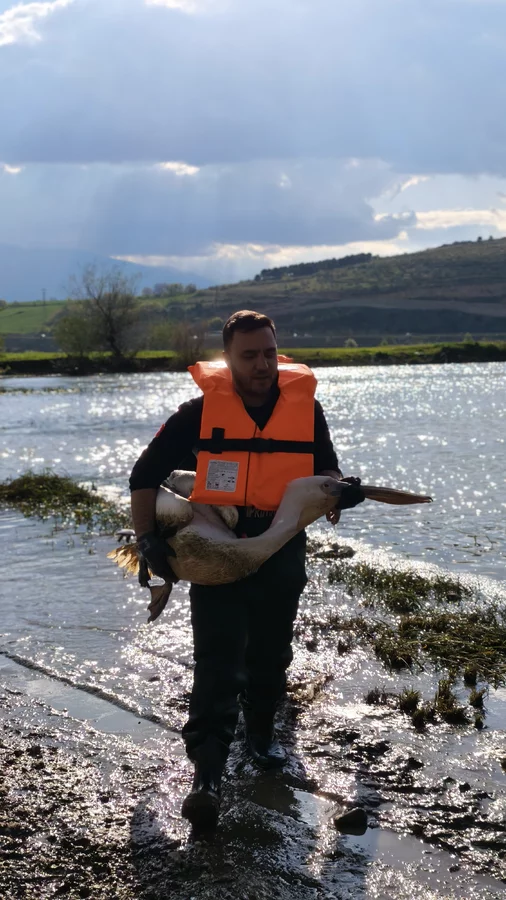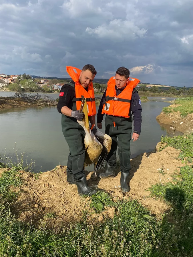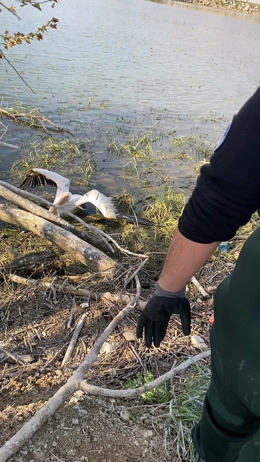 Zorlu şartlarda gerçekleştirilen çalışmada, çalılıklar arasında sıkıştığı belirlenen yaralı pelikan bulunduğu yerden dikkatli bir şekilde çıkarıldı.