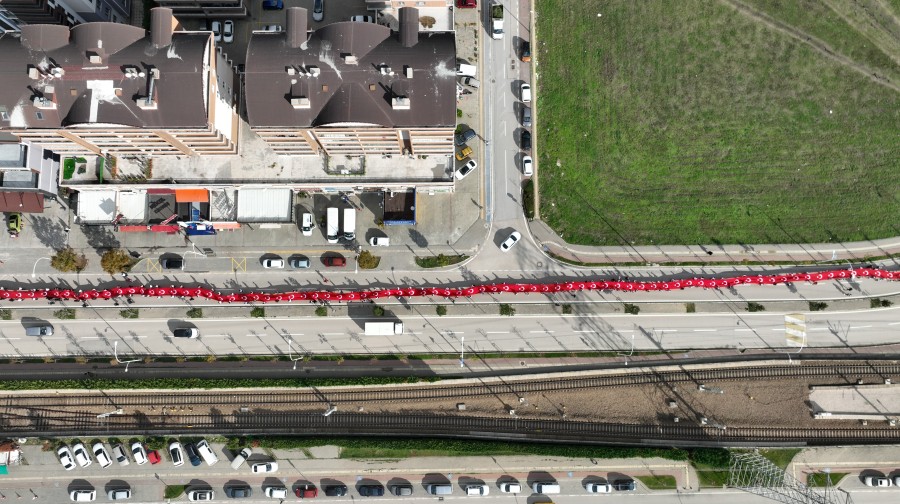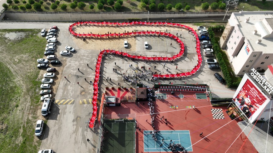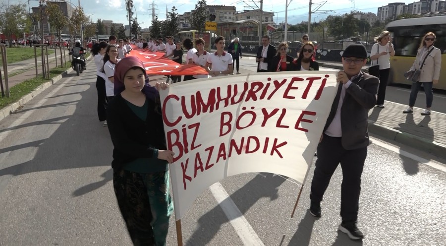 Bursa'da binlerce öğrencinin 500 metrelik dev Türk Bayrağı ile oluşturduğu Cumhuriyet korteji, herkes tarafından büyük ilgi gördü. 5 metro treni uzunluğundaki bayrak ile BURSARAY'ın yan yana geldiği anlar gökyüzünden drone ile görüntülendi. İki farklı bulvarı birleştiren bir cadde boyunca uzanan bayrağı yüzlerce öğrenci ellerinde taşıdı.
