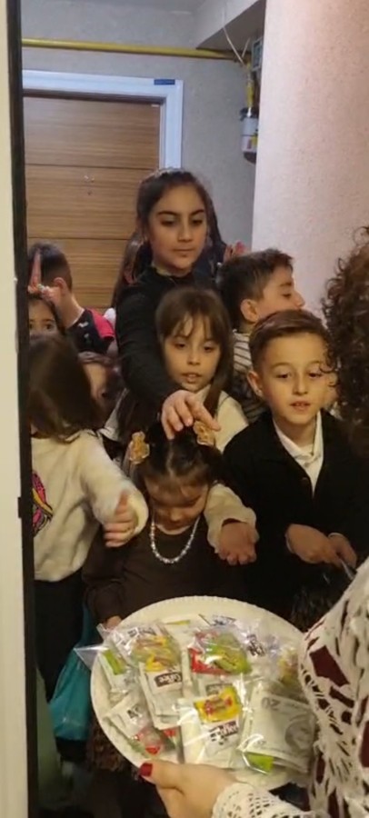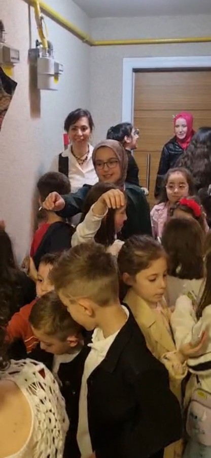 Sitede bulunan yaklaşık 20 çocuk, bir yetişkin eşliğinde sitedeki komşularının kapılarını tek tek çaldı.