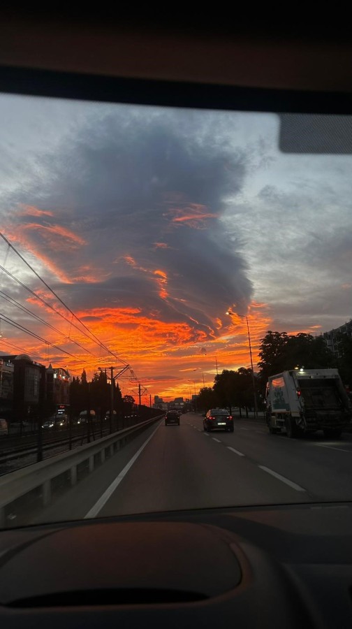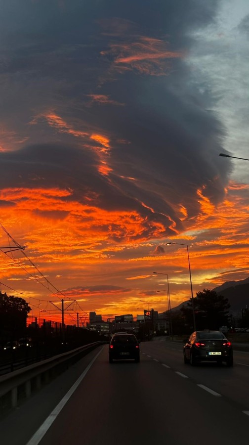 Bursa'da sabah saatlerinde gökyüzünde beliren sıra dışı bulut oluşumu şehrin farklı noktalarından görüntülendi. Gün doğumuyla birlikte turuncu ve kırmızı tonlarına bürünen gökyüzü, adeta kartpostallık manzaralar ortaya çıkardı.