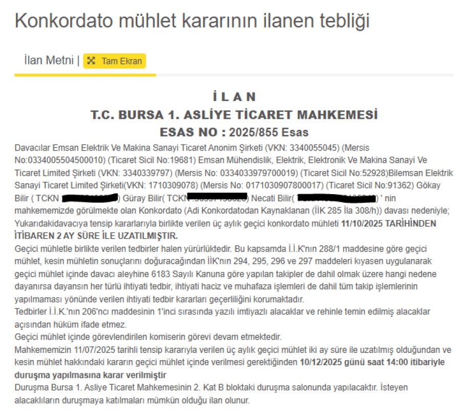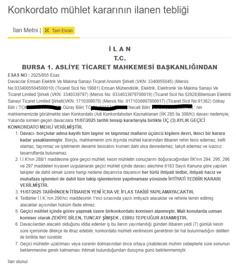 Bursa 1. Asliye Ticaret Mahkemesi, Emsan Elektrik ve Makina Sanayi Ticaret A.Ş., Emsan Mühendislik Elektrik Elektronik ve Makina Sanayi Tic. Ltd. Şti., Bilemsan Elektrik Sanayi Tic. Ltd. Şti. ile şirket ortakları Gökay Bilir, Güray Bilir ve Necati Bilir hakkında yürütülen konkordato davasında, üç aylık geçici konkordato mühleti verilmesine hükmetti.