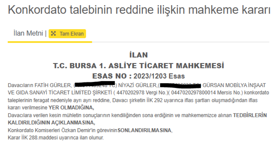 Aynı mahkemenin Fatih Gürler, Niyazi Gürler ve Gürsan Mobilya İnşaat ve Gıda Sanayi Ticaret Ltd. Şti. tarafından yapılan konkordato başvuruları, davacıların feragat etmeleri nedeniyle ayrı ayrı reddedildi.