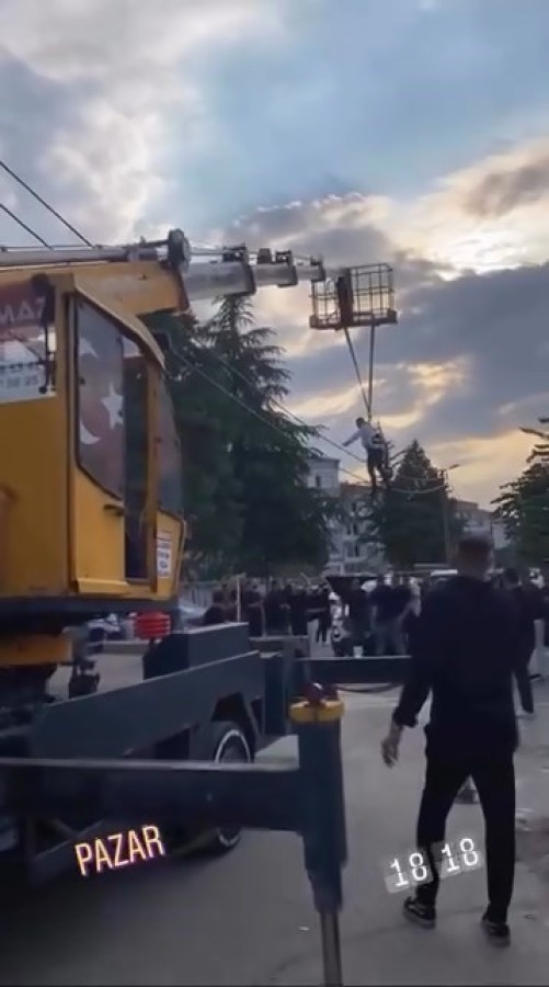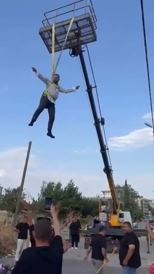 Damadın arkadaşları kiraladıkları vinç ile damadı iple sallandırdı.