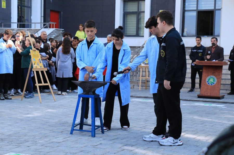 Makine, Matbaa, Elektrik-Elektronik, Tesisat ve İklimlendirme, Mobilya ile Bilişim Teknolojileri alanlarında eğitim gören 9. sınıf öğrencileri, törende önlüklerini giyerek mesleki hayata ilk adımlarını attı.