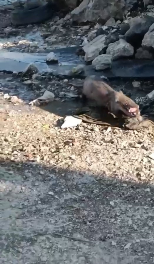 Kaçırdığı balıkları saklandığı kayalıkların altında afiyetle yiyen su samurunun bu mahareti mahallenin kedileri tarafından da ilgiyle izlendi.