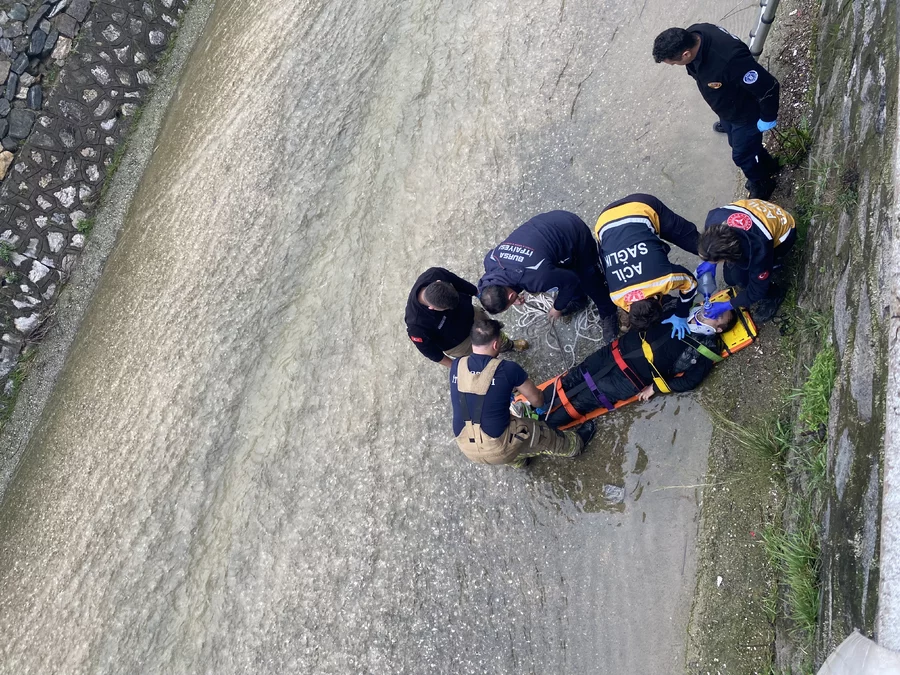 Şahıs, Bursa Büyükşehir Belediyesi itfaiye ekipleri ve sağlık çalışanları tarafından dere içerisinden kontrollü şekilde çıkarıldı.