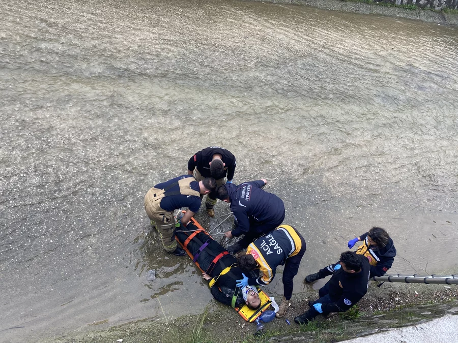 Bursa'nın Yıldırım ilçesinde dereye düşen, henüz kimliği belirlenemeyen bir adam kalp masajıyla hayata döndürüldü.
