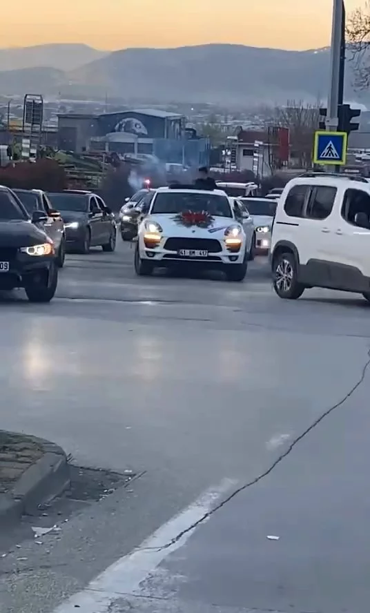 Gelin arabasının arkasından kornalar çalarak ilerleyen araçların bazıları, öne geçmek için hamle yaparken, bazıları ise bilinçsizce sağa sola doğru direksiyon kırdı.