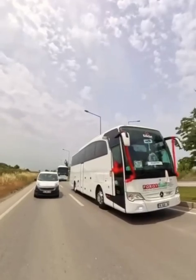 Düğün aracı gibi süslenen otobüsle yapılan şehir turu ilginç anlara sahne olurken, konvoydaki bazı otomobil sürücülerinin trafiği tehlikeye düşüren hareketleri tepkilere neden oldu.