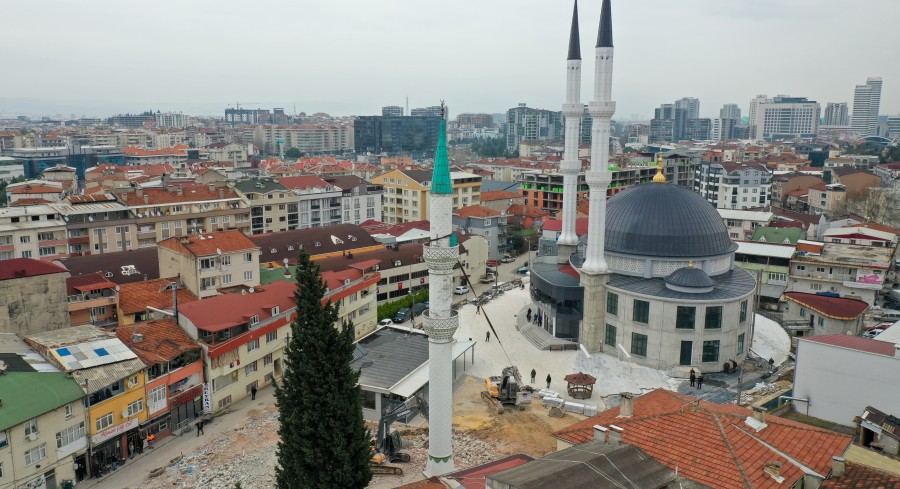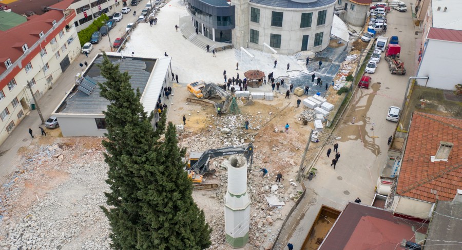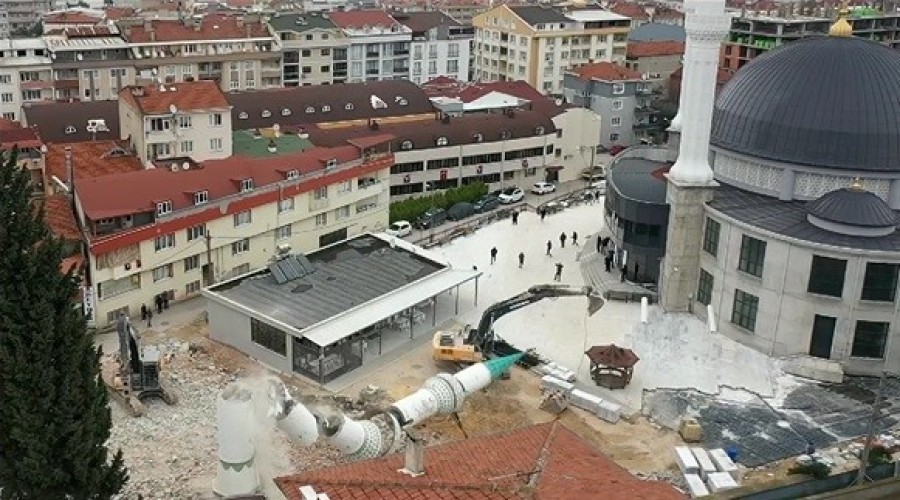 Çift minareli yeni Kuba Camii'nin hizmete açılmasıyla birlikte eski caminin minaresi Bursa Büyükşehir Belediyesine bağlı ekipler tarafından kontrollü şekilde yıkıldı.