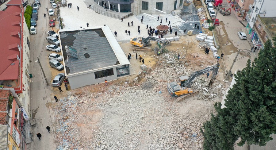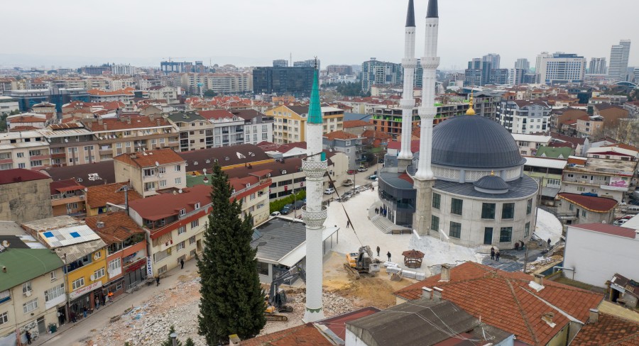 Bursa'da FETÖ'nün yıkılan okulunun yerine yapılan yeni cami inşaatı tamamlandı. Yeni cami tamamlanınca eski caminin minaresi kontrollü olarak yıkıldı. O anlar drone ile havadan görüntülendi.