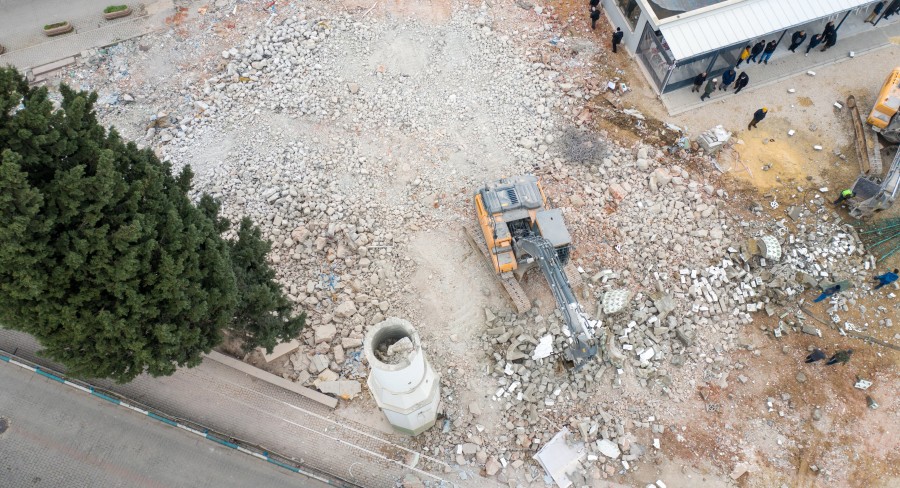 İş makinesinin önce deldiği minare daha sonra çelik halat ile bağlanıp başka bir iş makinesi ile çekilerek aşağıya indirildi.