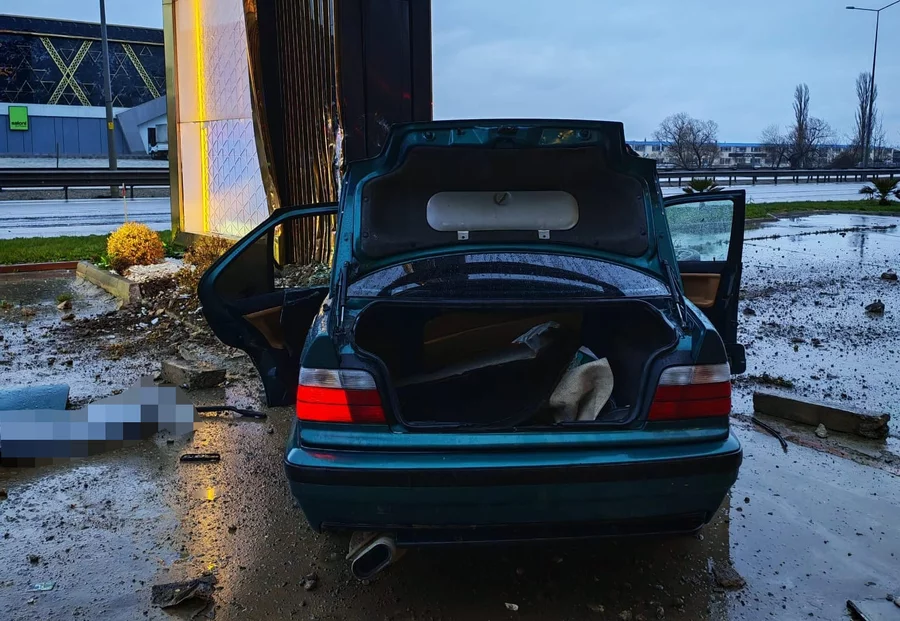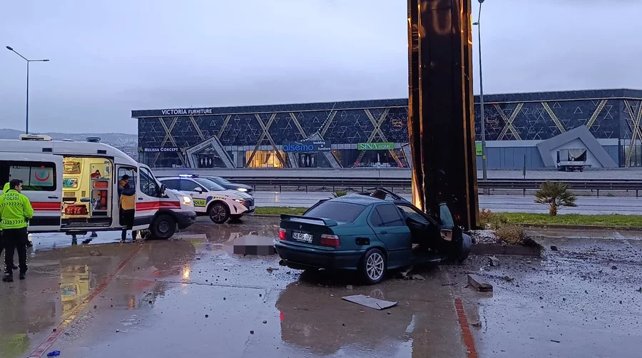 İnegöl yönüne seyreden İmran S. (18) yönetimindeki 48 RG 073 plakalı otomobil, yağışın etkisiyle kayganlaşan yolda kontrolden çıkarak, yol kenarındaki bir mobilya mağazasının beton reklam panosuna çarptı.