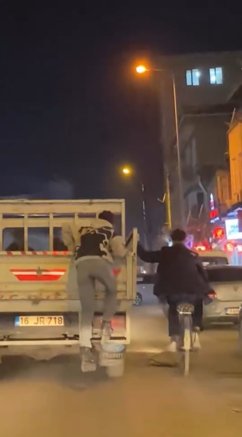 Görüntülerde gençlerin zaman zaman dengesini kaybetme tehlikesi yaşadığı görülürken, çevredeki sürücüler de duruma tepki gösterdi.