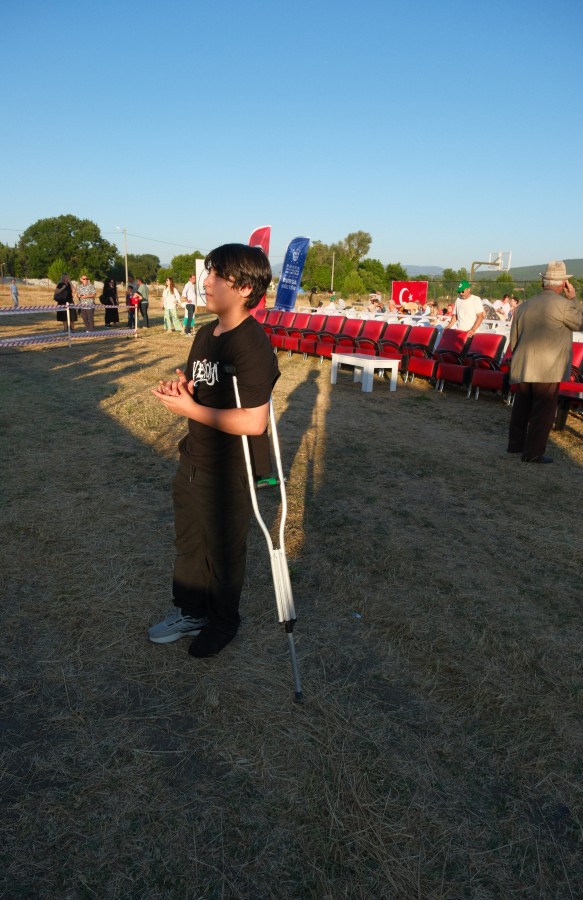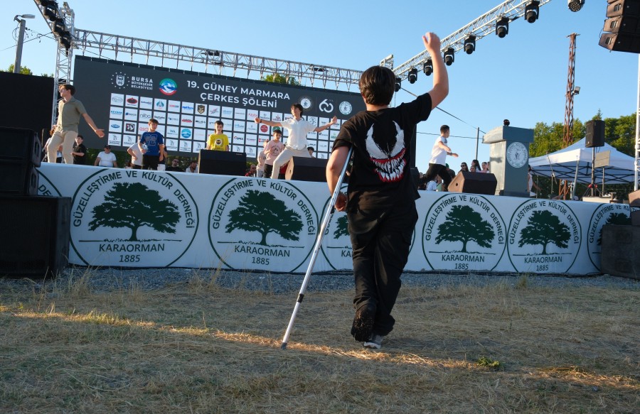 Bursa'da düzenlenen 19. Güney Marmara Çerkes Şöleni'nde izleyenlerin yüreğini burkan bir an yaşandı. Bugüne kadar arkadaşları ile birlikte sahne alan genç, ayağını kırınca gösteriye katılamadı. Koltuk değnekleriyle tören alanına gelen genç, prova yapan arkadaşlarına uzaktan eşlik etti.
