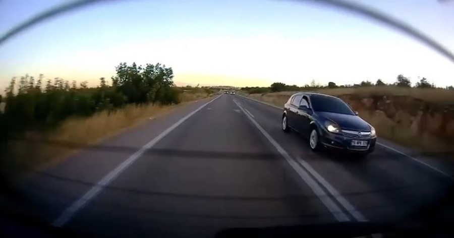 Tek şeritli yolda önündeki otomobili sollayan Opel marka otomobilin sürücüsü, hatalı sollama sonucu karşı yönden gelen motosikletle burun buruna geldi.