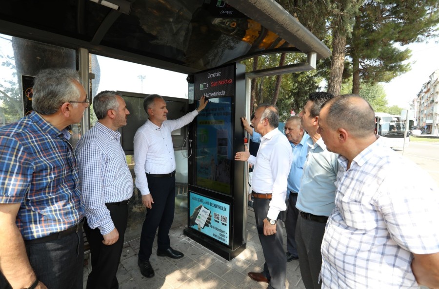 Belediye Başkanı Alper Taban, ilk akıllı durak uygulamasının tamamlanması sonrası incelemelerde bulundu. Burada bir açıklama da yapan Başkan Taban, "Şehrimizde hayata geçirdiğimiz ilk Akıllı Durak uygulamasıyla ilgili yerinde inceleme yapıyoruz. Şu anda bulunduğumuz noktada Bilgi İşlem Müdürlüğümüzün kendi bünyesinde geliştirdiği Akıllı Durak uygulamasıyla birden fazla fonksiyonu vatandaşlarımız kullanabiliyor durumda. Akıllı Durakta ne gibi fonksiyonlar var; tarih ve saat bilgisi, hava sıcaklığı, bulunduğu durakta gelecek otobüslerin bilgisini anlık olarak görüyor olacaklar. Aynı zamanda ücretsiz wifi ve tanıtım ekranında duyurularımız, faaliyetlerimiz yer alacak. Kurulan telefon sistemiyle de vatandaşlarımız ahizeyi kaldırdıkları gibi Çözüm Merkezimizdeki operatörlerden cevap alabilecekler. Şehir kameraları uygulamasıyla vatandaşlarımız bu alanda da görüntü alabiliyor olacaklar. Beklerken telefonlarını şarj edebilecekleri de bir alan bulunuyor Akıllı Durakta" dedi.