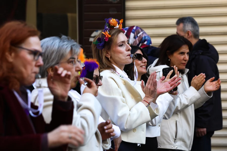 Ellerinde 'İstismarı aklama! Asla yalnız yürümeyeceksin!' yazılı döviz, afiş ve pankartlar taşıyan kadınlar, 'Yaşasın kadın dayanışması' sloganları atarak görünmez kılınmalarına, emeklerinin değersizleştirilmesine, şiddete ve ayrımcılığa karşı dayanışma mesajı verildi. Etkinliğe katılanlara rozet ve toka dağıtılırken, kadınlar saçlarına taktıkları çiçeklerle caddeyi adeta renk cümbüşüne çevirdi.