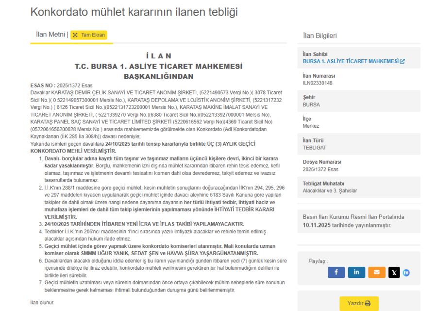 Bursa 1. Asliye Ticaret Mahkemesi, Karataş Demir Çelik Sanayi ve Ticaret A.Ş., Karataş Depolama ve Lojistik A.Ş., Karataş Makine İmalat Sanayi ve Ticaret A.Ş. ile Karataş Panel Saç Sanayi ve Ticaret Ltd. Şti. hakkında verilen karar, 24 Ekim tarihli tensip tutanağıyla ilan edildi.