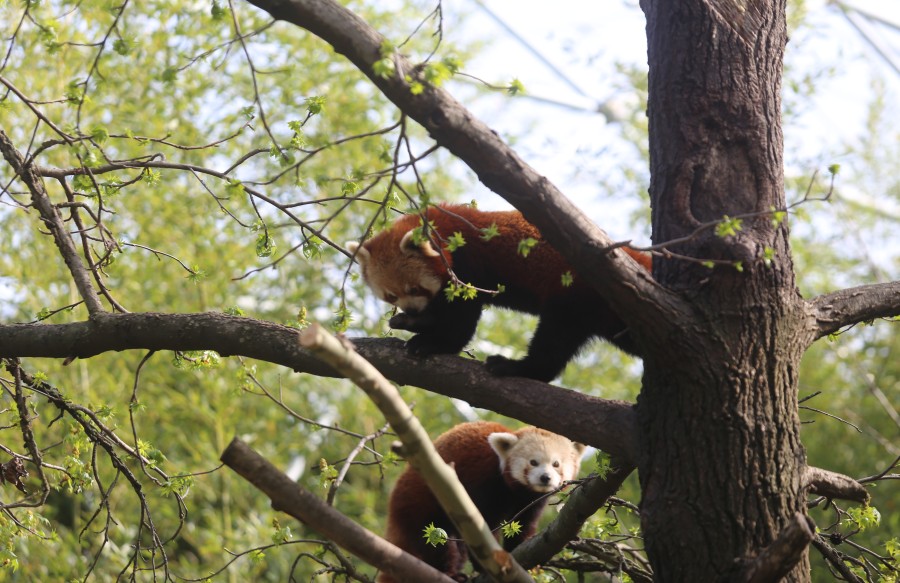 Panda bekçisi tarafından verilen taze elmaları midelerine indiren pandalar, güneşin tadını ağacın üstünde çıkararak dinlenmeye devam etti.