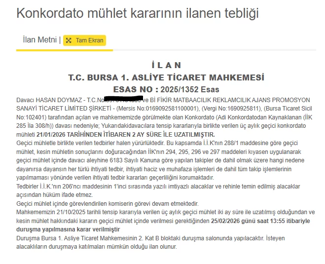 Bursa 1. Asliye Ticaret Mahkemesi'nde görülen Hasan Doymaz ile Bİ Fikir Matbaacılık Reklamcılık Ajans Promosyon Sanayi Ticaret Limited Şirketi tarafından açılan konkordato davasında, daha önce verilen üç aylık geçici konkordato mühleti, 21 Ocak 2026 tarihinden itibaren geçerli olmak üzere iki ay süreyle uzatıldı.